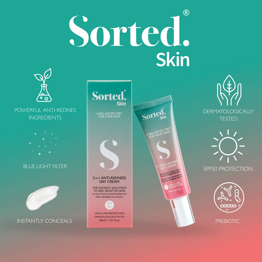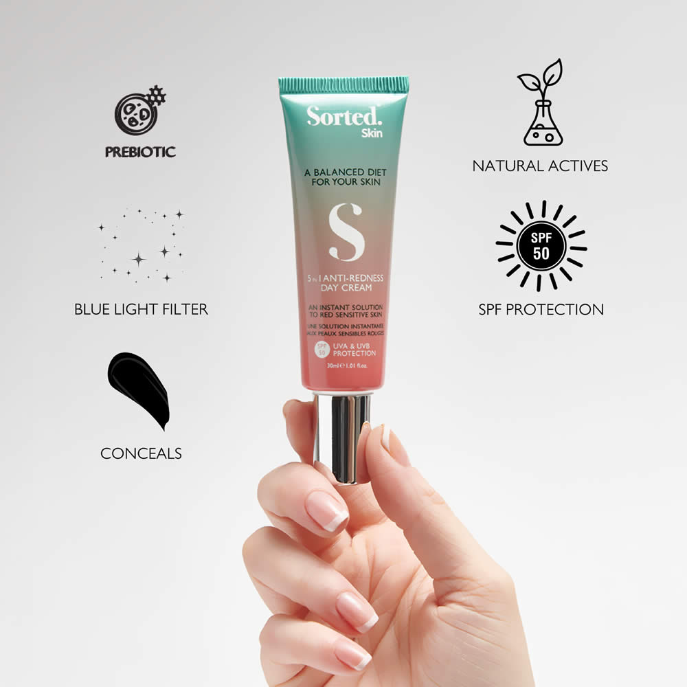 Sorted 5 in 1 Anti-Redness Day Cream. Et banebrydende hybridprodukt, der kombinerer præbiotisk hudpleje, anti-inflammatorisk behandling, digital lys- og solbeskyttelse samt farvekorrigerende teknologi i én enkel dagcreme.